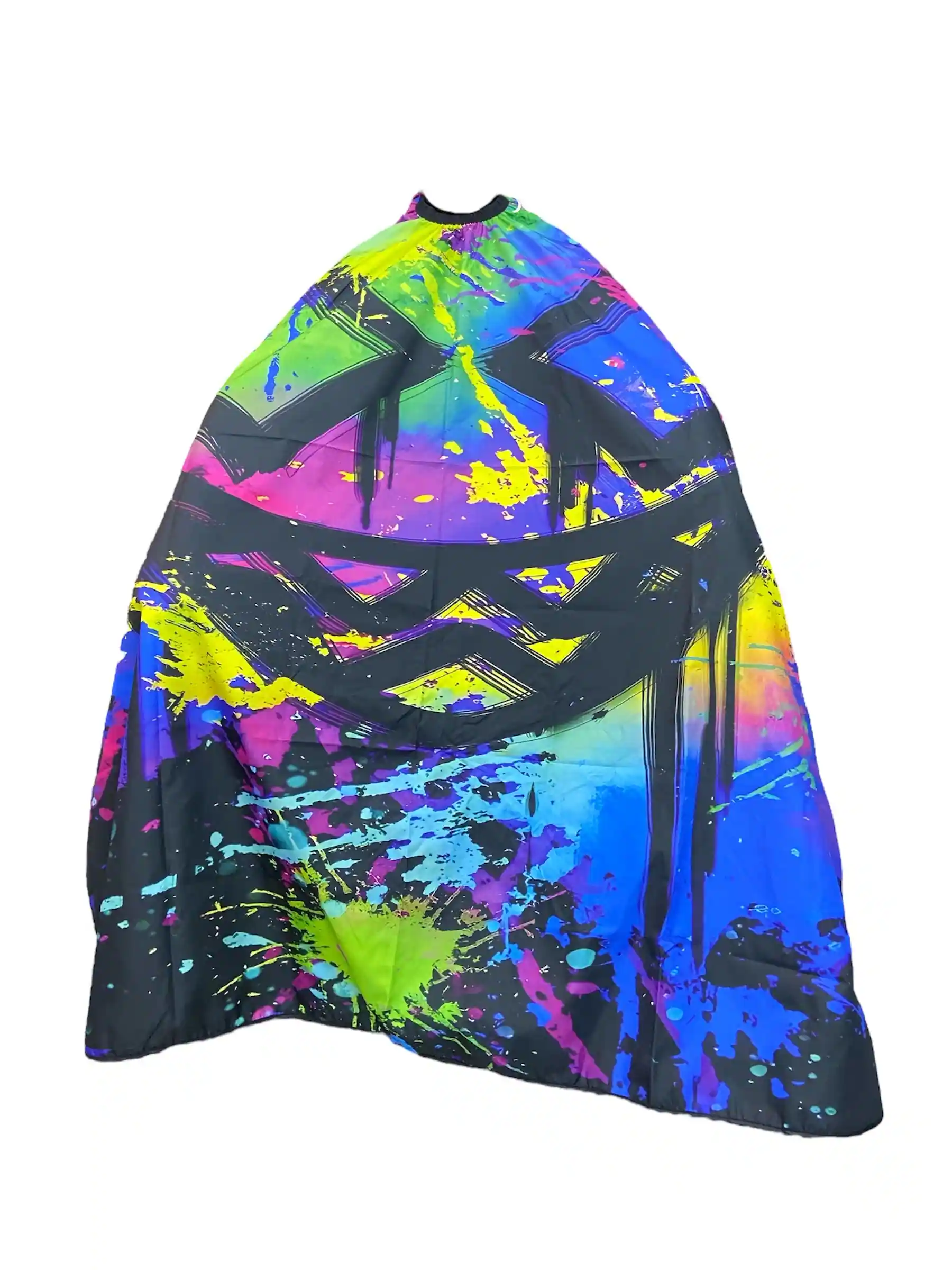 ¡Explosión de color y arte urbano en tu salón! La capa de barbería profesional PB-033 destaca por su vibrante diseño de salpicaduras y trazos estilo graffiti en tonos neón. Con un tamaño Extra Grande (XL), garantiza una protección total del cliente con un estilo vanguardista y rebelde.